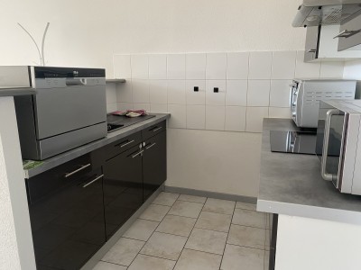Loue bel appartement de type F2 de 54 m2 au RDC surélevé entièrement meublé et équipé avec une grande pièce de vie lumineuse et une cuisine ouverte , proche des commodités des transports, des entreprises et de la ville
